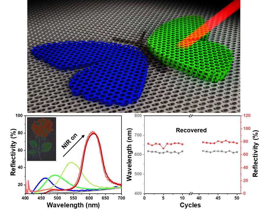 研究团队将光子晶体反蛋白石多孔结构设计到共价交联的聚苯乙烯/聚丙烯酸正丁酯形状记忆材料中,得益于聚苯乙烯/聚丙烯酸正丁酯形状记忆材料较宽的玻璃化转变温度(从47~105 ℃),该材料可拥有多个临时形状,且均能在室温稳定维持。采用近红外光照射(光热效应),即可实现形状记忆光子晶体材料临时形状在纳米尺度上的快速精准回复,由此改变光子晶体晶格间距,从而带来肉眼可见的颜色变化。而且,通过改变光照时间便可控制形状回复程度,进而可以程控颜色变化。值得强调的是,利用近红外激光可在同一张形状记忆光子晶体薄膜上直写出多种色彩(红绿蓝等),在反复擦写50次以上仍保持优异性能;同时,利用激光还可以将A4纸上的黑色图案彩色复印到形状记忆光子晶体薄膜上,复印下来的信息可以在室温下稳定保持超过一年。
