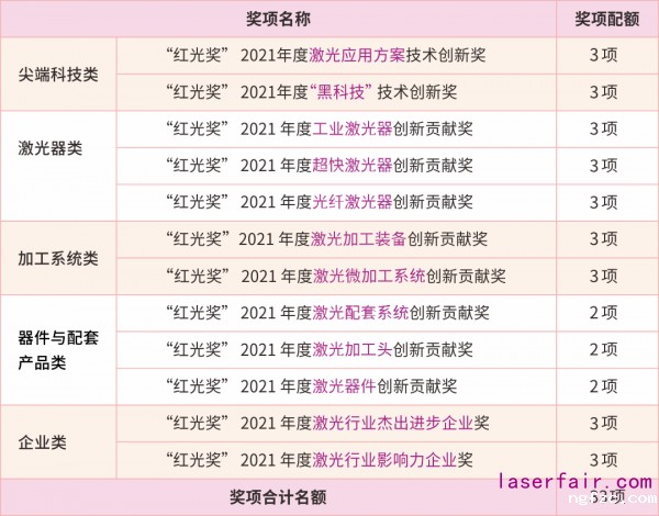 “红光奖”2021年度激光行业创新贡献奖评选活动即日开启报名!33项创新贡献奖等你来拿,详情如下: