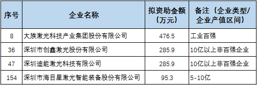 2020年重点工业企业扩产增效奖励项目拟资助计划(第一批)名单共有214家企业,拟资助金额总计达3.95亿元。其中激光企业有4家,分别是大族激光、创鑫激光、迪能激光、海目星激光。