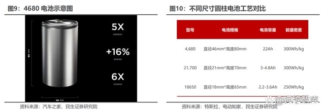 传统的圆柱电池可分为18650和21700,特斯拉在2020年电池日上创造性地推出4680电池,在21700的基础上对电池直径和高度同时做了扩展,直径增加一倍多至46mm,高度增加至80mm。根据特斯拉公布的数据,相较于21700,4680单颗电芯容量提升5倍,功率提升6倍,实现16%的续航里程提升的同时降本14%,且单GWh投资成本降低7%。