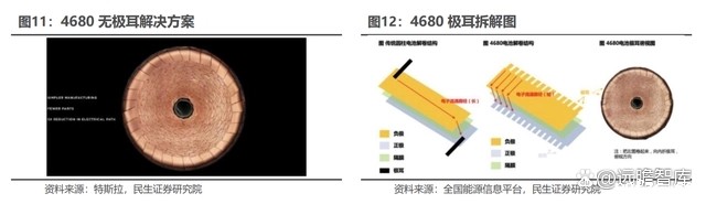 传统的1860电池卷绕长度是800mm,意味着电流要通过800mm长的导线,对应电阻大约是20mΩ;2170电池卷绕长度为1000mm,则电流导出通过的长度就需要1000mm,电阻约为23mΩ;4680电池将整个集流体变成极耳,电流从沿极耳到集流盘横向运输变成集流体纵向传输,原本的800-1000mm的导电长度锐减到80mm(对应电池高度,纵向运输),电阻降低至2mΩ,内阻消耗由2W降低到0.2W,最大程度提升电池输出功率。