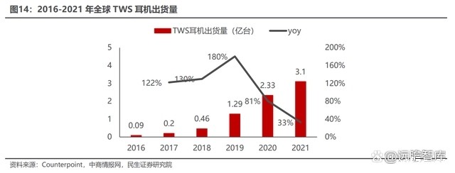 TWS耳机放量助力纽扣电池市场增长。近年来,全球TWS耳机出货量呈现快速增长趋势,2016-2021年,全球TWS耳机出货量从0.09亿台增长至3.1亿台,复合增长率达102.97%。
