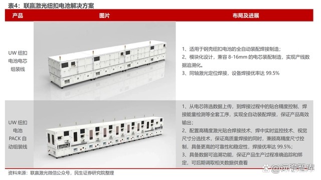 联赢激光提前布局纽扣电池焊接设备解决方案,有望迎来收获期。针对纽扣电池在焊接过程中的各种痛点及难题,联赢激光顺势进行一系列积极的技术升级,并探索出行业领先的纽扣电池装备智造方案,包括UW纽扣电池电芯组装线及UW纽扣电池PACK自动组装线,可根据客户需求进行相应配置调整,兼容8-16mm的电芯装配制造,配备焊中实时监控技术及视觉尺寸分选技术,焊接优率高达99.5%。