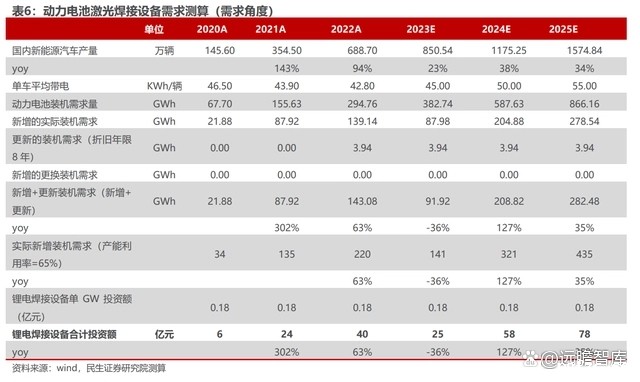乘联会预计2023年新能源乘用车销量850万辆。根据我们的测算,2023-2025年国内新能源汽车的销售量将分别达到850/1175/1574万辆,假设单GW对应锂电设备投资额为1.8亿元,激光焊接设备占锂电设备投资额份额为10%,则2023-2025年的实际动力电池激光焊接设备采购额分别为25/58/78亿元。