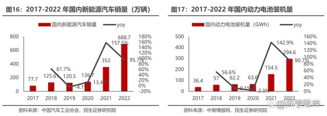 根据中国汽车工业协会的数据,近年来我国新能源汽车销量高速增长,由2017年的77.7万辆增长至2022年的688.7万辆,CAGR为54.7%。新能源汽车销量高增下动力电池装机量随之攀升,2017年-2022年,我国动力电池装机量由36.4GWh提升至294.6GWh,复合增速达47.9%。