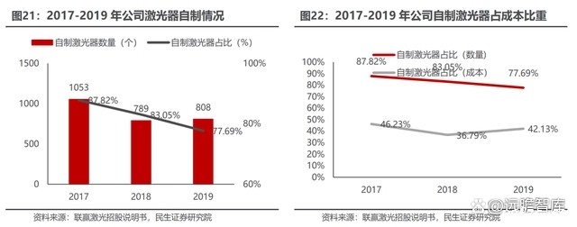 公司激光器自制比例高,有效降低生产成本。2017-2019年,公司自制激光器销售数量分别为1053台、789台和808台,占激光器整体销售数量比例分别为87.82%、83.05%和77.69%,整体维持较高自制水平。