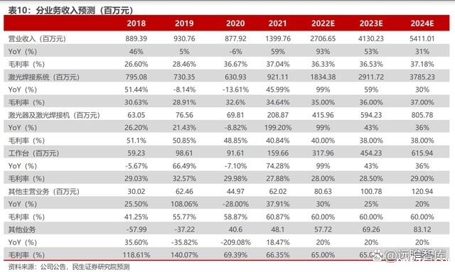 工作台业务系公司因激光焊接设备订单之间规模差异较大,为便于分析而拆分出的业务,因此营收增长趋势我们预计与激光焊接系统趋近,随着下游景气度提升,工作台收入有望实现高增长,毛利率受益于规模体量的增加及上游原材料降价有望逐渐提升。