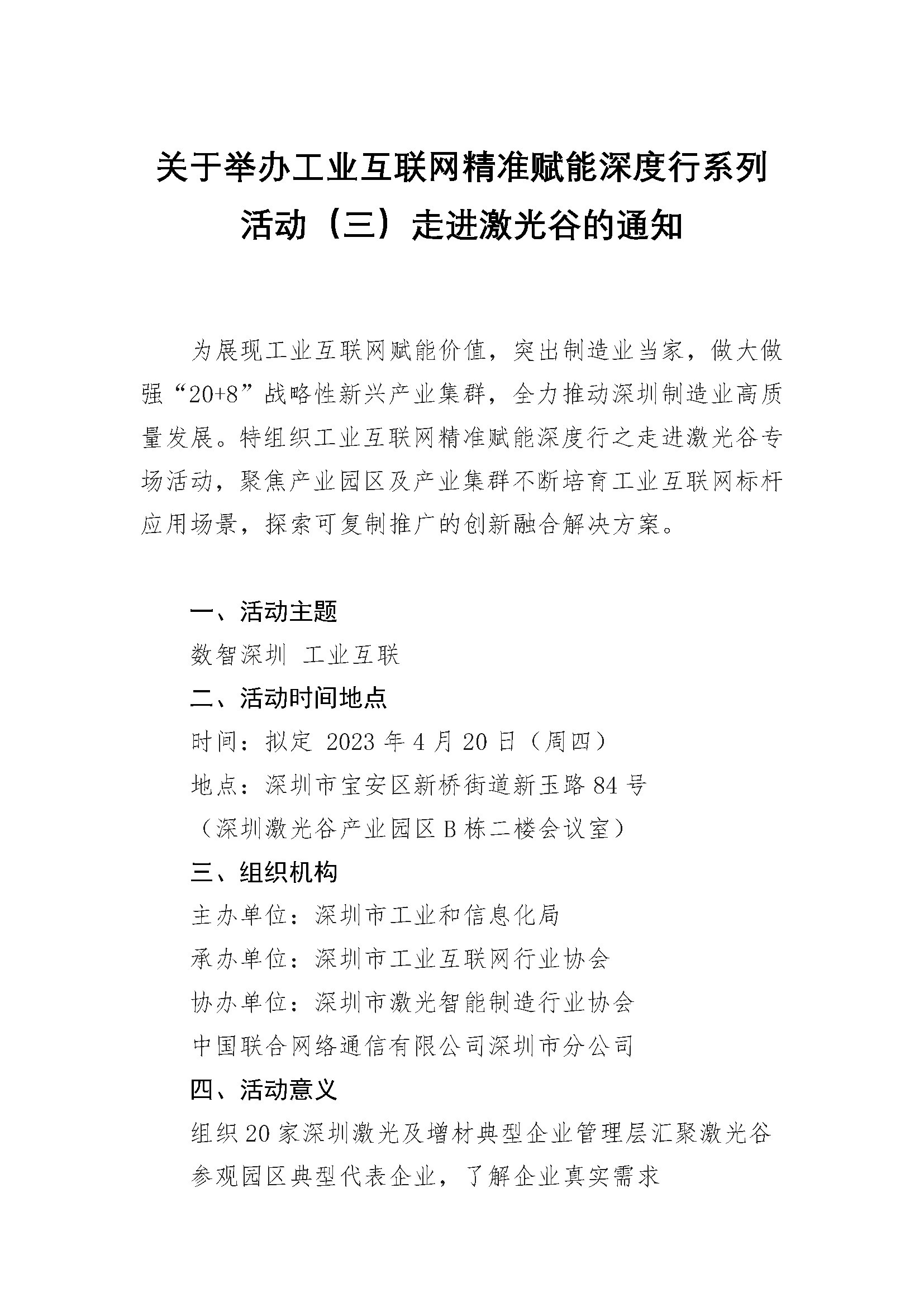 关于举办工业互联网精准赋能深度行系列 活动(三)走进激光谷的通知