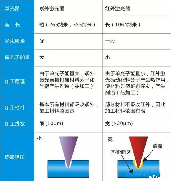 二是使用紫外激光:高能量的紫外光子直接破坏许多非金属材料表面的分子键,使分子脱离物体,这种方式不会产生高的热量,故被称为冷加工,主要采用紫外激光(波长为355nm)。