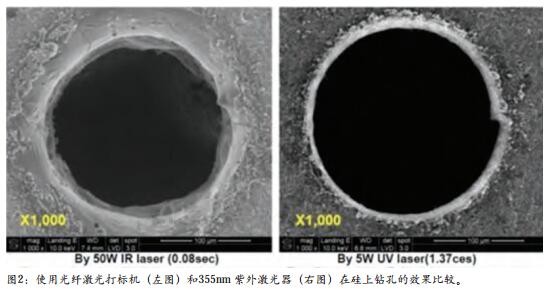 图 2 中分别给出了使用光纤激光打标机(左图)和 355nm 的紫外激光器(右图)在硅上钻孔的效果图。尽管紫外激光器能提供比光纤激光器更好的加工质量,但是对于这种特定应用而言,光纤激光器的加工效果已经足够好,其加工质量足以满足应用要求。此外,光纤激光器的加工速度比紫外激光器快 17 倍,且其成本仅为紫外激光器的 50%。由于激光路径程序误差,紫外激光器加工的孔的圆度略有缺陷。