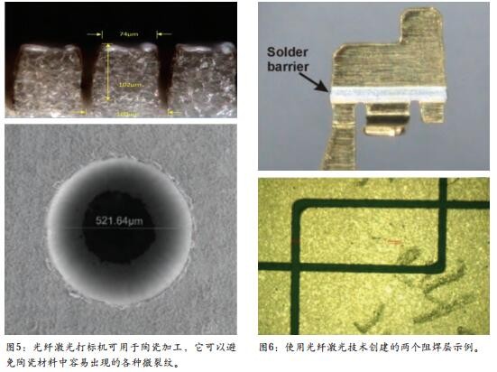 陶瓷也是微电子学中的一种常用材料,355nm 的紫外激光器通常用于陶瓷材料的划线和钻孔。图 5 中显示了光纤激光打标机可以用于陶瓷加工,因为它可以避免陶瓷材料中容易出现的各种微裂纹。