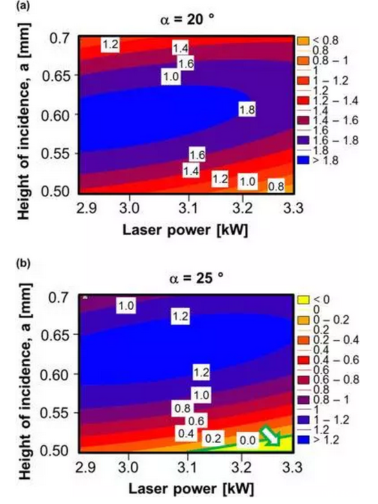 Nikolai Kashaev等人对Ti-6Al-4V对接接头和T接头进行Nd:YAG单面激光焊接工艺进行了研究,使用合金兼容的填充焊丝来避免底部填充和咬边。他们使用二次回归建立了“非焊接皮”宽度与激光功率、入射角和入射高度的关系,通过合理的参数优化,获得了具有低孔隙率和适当几何形状的焊缝。优化结果如图2.2所示。