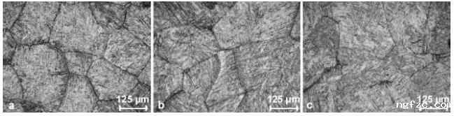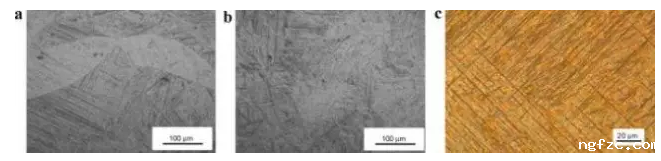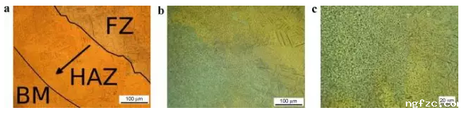 图3.2 FZ的组织:(a)0.8kW,17mm / s,(b)1 kW,50mm / s, (c)是b中的马氏体结构