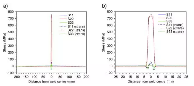 图5.4 残余应力分布:(a)在所有三个主要方向上,在焊缝附近的整个宽度上,(b)横向(11),纵向(22)和具有及不具有相变的法线方向