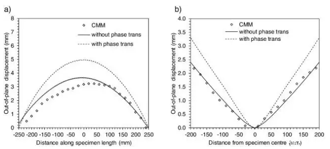 图5.5 模拟(a)翘曲,(b) 有和没有相变的平面失真角度的大小