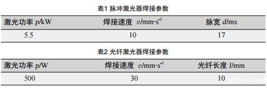 实验过程中采用金相分析法评估焊接质量,通过拉力测试评估焊接强度,并通过测量焊后工件外观尺寸的方法评估焊接变形。实验中的焊接参数如表 1、表 2 所示。