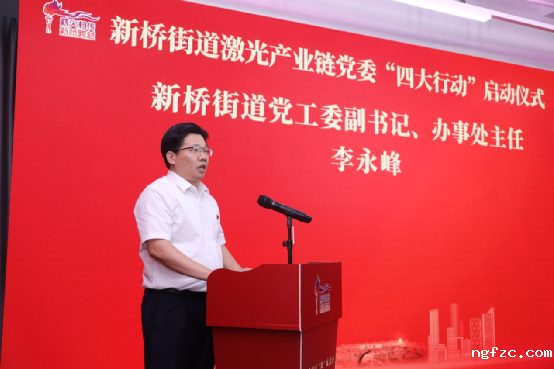 在“四大行动” 启动仪式上,新桥激光产业链党委书记邵火到会讲话,他重点介绍了主题活动的目的、意义,形式和内容,以及全面介绍并解读实施方案,党建带动产业发展相关情况。如:开展激光论坛、“红光奖”评选活动等。