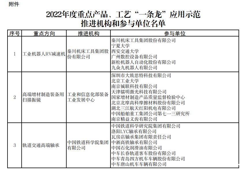 “2022年度重点产品、工艺‘一条龙’应用示范方向、推进机构和参与单位名单”具体如下: