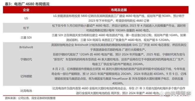 特斯拉主导大圆柱电池,带动多家整车厂入场,电池厂加速布局产能。目前特斯拉德州超级工厂已在批产搭载于Model Y的4680电池。宝马4695电池有望在2024年量产,或成为其纯电平台Neue Klasse的主力电池。此外,蔚来、江淮、保时捷、东风岚图等多家整车厂也明确表示旗下车型将会搭载4680大圆柱电池。在此背景下,国内海外电池厂加速布局大圆柱电池产能。