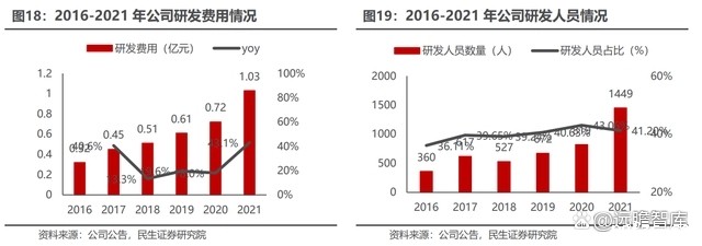 2019-2021年,公司研发费用分别为0.61/0.72/1.03亿元,同比增长19.6%/18%/43.1%,占营收比重稳定在6%-8%。研发人员方面,截至2022年6月31日,公司研发人员达1936人,占员工总人数的40.09%。