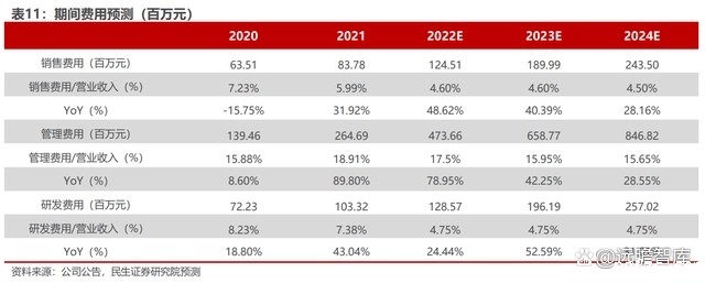 2)管理费用率 :我们预计随着公司产能提升由人员扩张转向人效提升,管理费用率将会呈下行趋势,2022-2024年分别为17.5%、15.95%、15.65%。