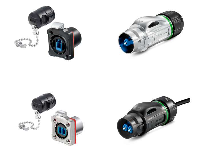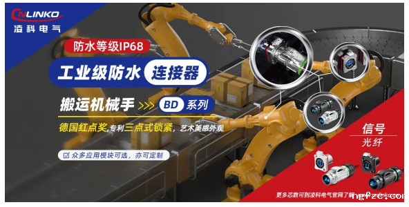 凌科上述BD系列光纤连接器,传输速率高,可单手快速插拔操作,同时还能抵御恶劣环境因素造成的威胁,可实现IP68级防水、耐高温抗严寒、防腐蚀、抗UV、抗振抗冲击等特点,可完全适应工业机械手(机器人)的使用环境,并能为数据传输带来安全可靠的技术保障。