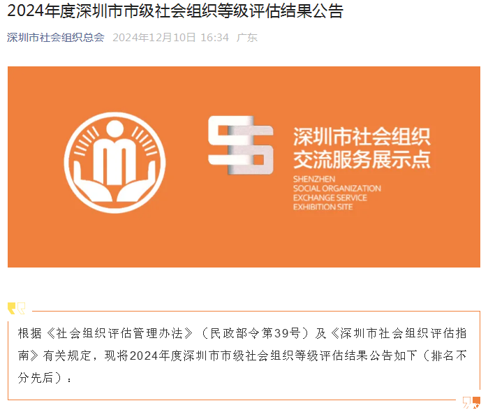 根据《社会组织评估管理办法》(民政部令第39号)及《深圳市社会组织评估指南》有关规定,现将2024年度深圳市市级社会组织等级评估结果公告如下(排名不分先后):