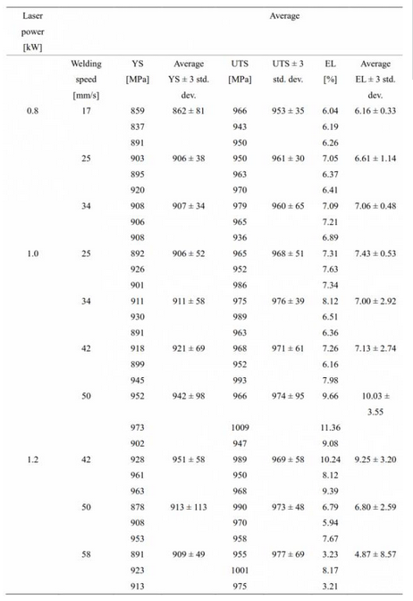 研究表明Nd:YAG激光器加工后的焊接质量高于用光纤激光器或二极管激光器产生的焊缝。三种焊接类型的硬度值非常相似。但是强度和塑性不同,这主要是受到不同类型孔的焊接缺陷的影响。三种焊接形式的力学性能如表4.2所示。